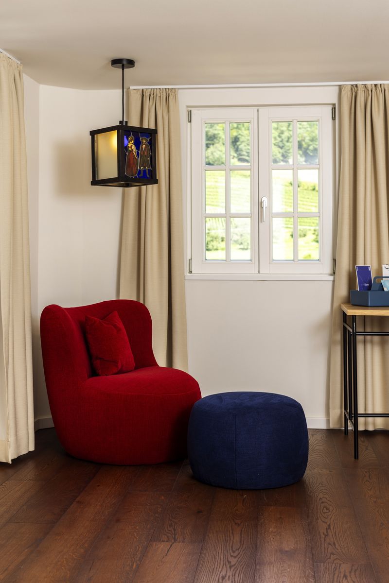 Großzügiges Doppelzimmer im Fachwerkhaus mit Design-Ambiente und Sitzecke. Zeitloses Interieur trifft traditionelle Sprossenfenster und jahrhundertealte Balkenstruktur.